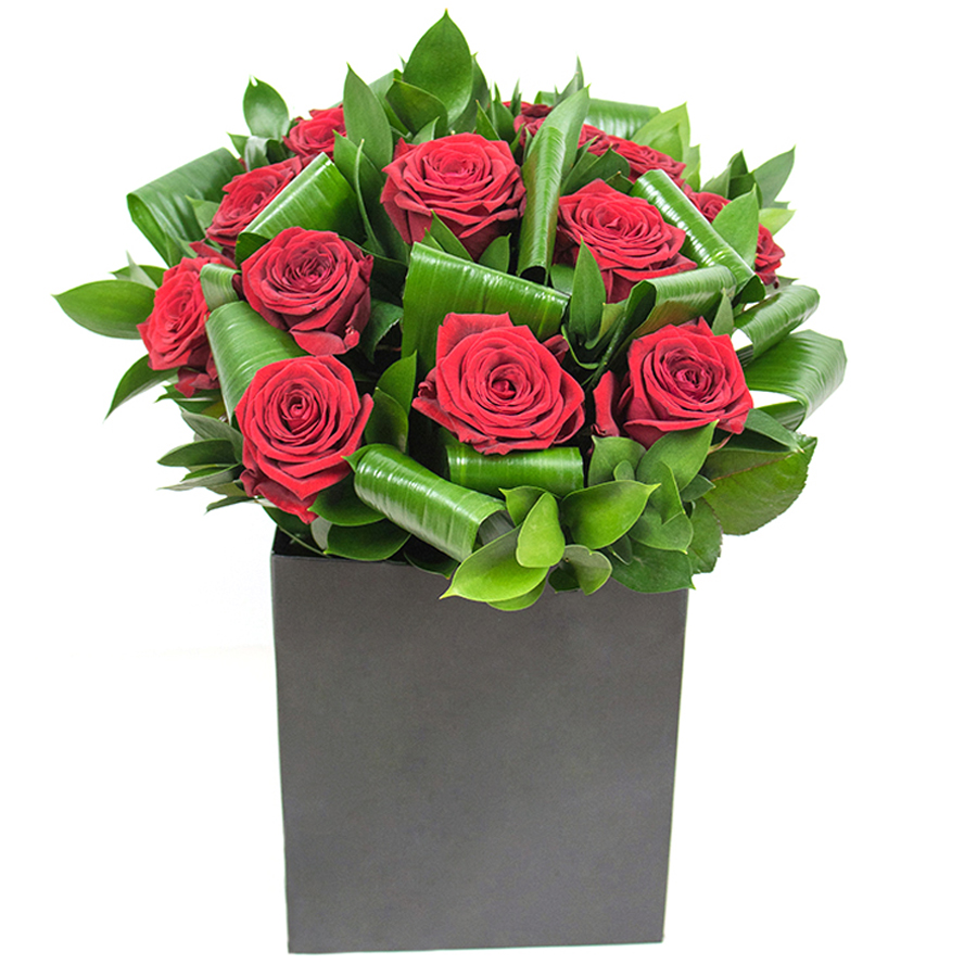 Our gorgeous bouquet features vibrant red roses combined with rich aspidistra leaves and delicate ruscus, creating a unique and elegant floral display that adds sophistication to any space.